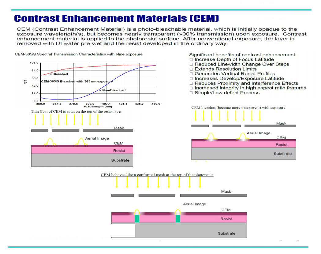 CEM (Contrast Enhancement Material) is a photo-bleachable material, water soluble layer which is initially opaque to the exposure wavelength(s), but it becomes nearly transparent (»90% transmission) upon exposure. Contrast enhancement material is spun onto the photoresist surface. After conventional exposure, the CEM layer is removed with DI water followed by the resist developing. Because of the presence of the bleachable material, the resist contrast is dramatically improved. This CEM bleachability depends on the film thickness, photochemical properties of the CEM and the dose required to expose the resist.